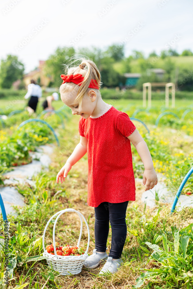 Little kid girl picking strawberry on self-picking farm. Smile. Harvesting concept. Red clothes.