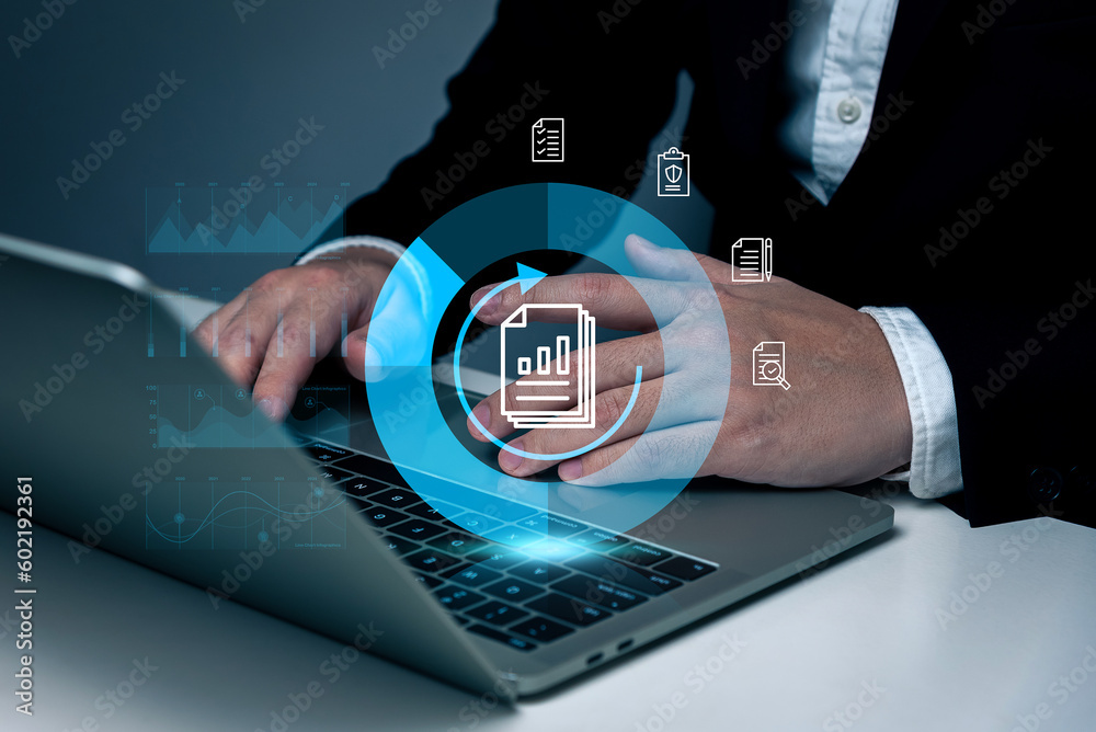 Digital file management concept, businessman working with laptop for management folder, database, IT consultant, software for archiving corporate files, AI tech, digital transformation, IOT.