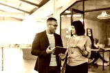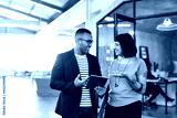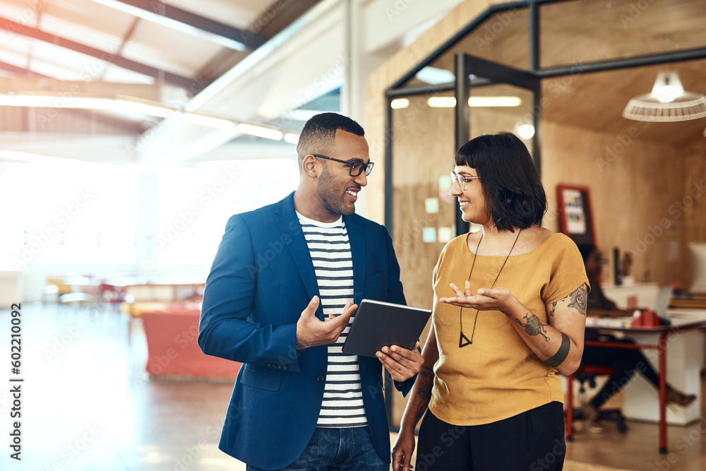 Business people, tablet and a team talking in office with ideas, internet and online motivation. A professional man and woman together for a creative startup project with app for discussion or advice