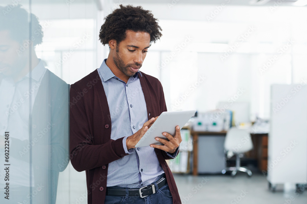 Research, digital tablet and black man in office for planning, email and schedule management. Search, browse and african worker online for business marketing, web and app for creative startup plan
