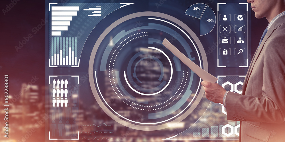 Digital background with infographs and man extending papers or contract