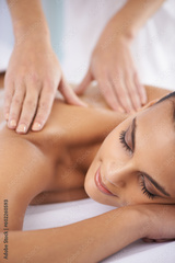 Luxury, spa and woman with a smile, massage and holistic treatment with self care, grooming and joyful. Female person, lady and client with stress relief, skincare and body care on vacation and break