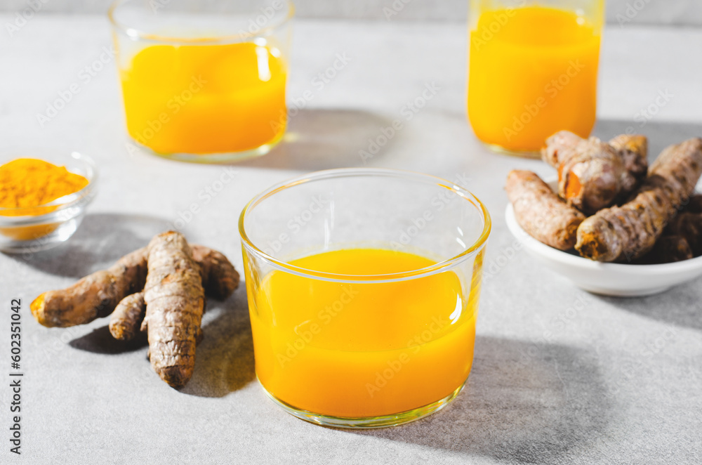 Turmeric Shots, Healthy Beverage with Turmeric Root and Spices, Jamu Juice, Immunity Booster Drink on Grey Background