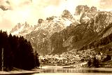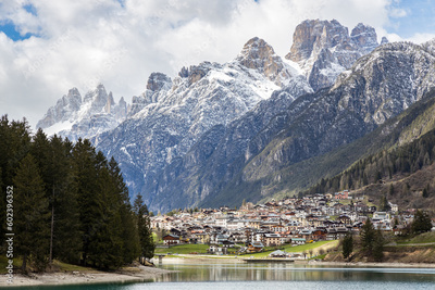 View of Auronzo Lake in the village of Auronzo di Cadore Belluno, Dolomites, Italy