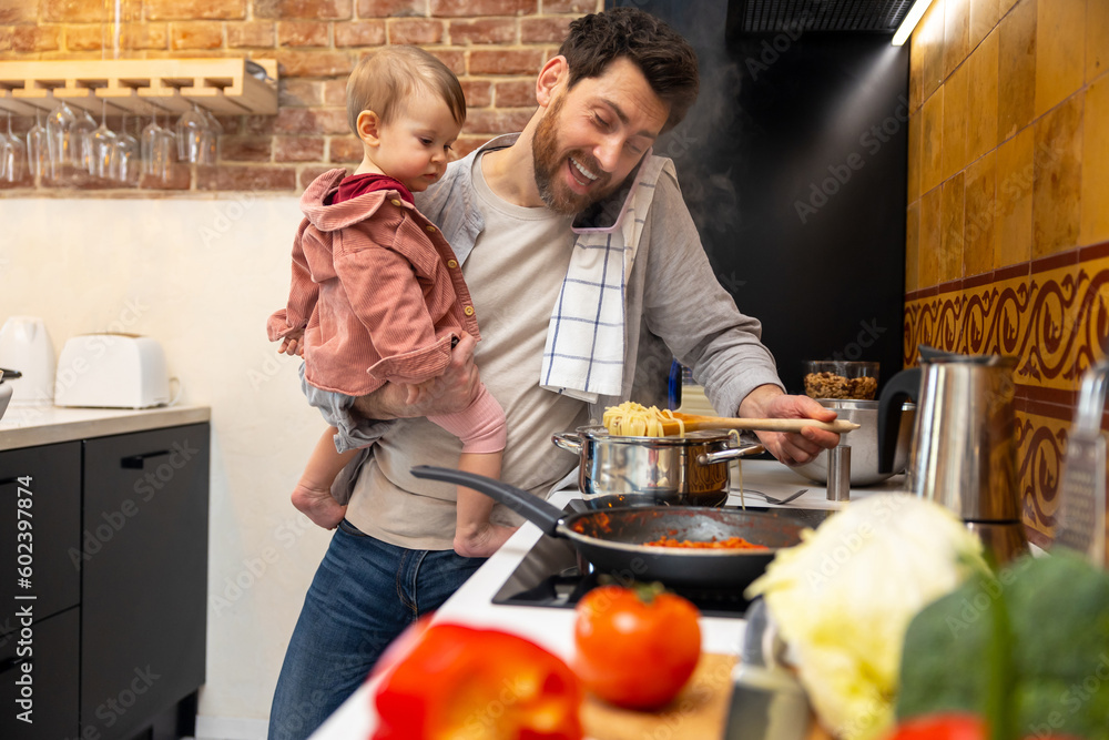 Multitasking father babysitting, cooking breakfast and talking on smart phone at home.