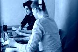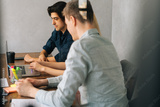 Side view of male and female employees sitting at office desk looking at laptop screen cooperating in office. Focused colleagues brainstorm together at meeting room. Concept of corporate work meeting