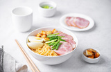 Ramen noodle with meat slices, fried Tofu, eggs and scallions in a bowl