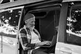 Happy older man sitting in rv camper van using laptop. Smiling mature active traveler holding computer on lap remote working online and enjoying vanlife, freedom, resting in outdoor camping.