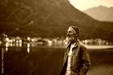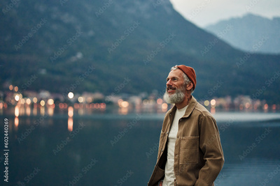 Happy older man standing in nature park enjoying natural park landscape. Smiling mature active traveler exploring camping tourism nature lake and mountains travel journey feeling freedom.