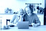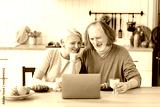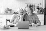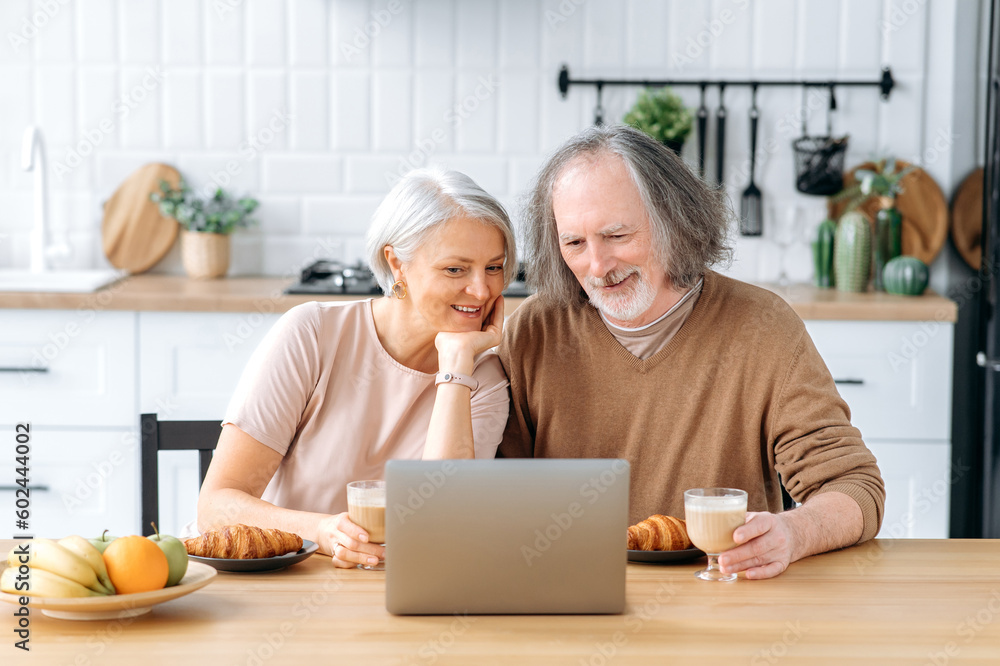 Positive husband and wife, sit at home in the kitchen, have croissants and coffee for breakfast, use a laptop during breakfast, read news, watch videos, smile. Happy modern caucasian pensioner couple