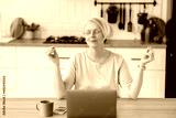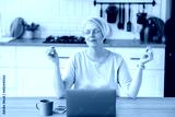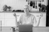 Meditation concept. Calm relaxed mature caucasian gray haired woman, sitting at home in the kitchen at the table with a laptop, relaxing while working online, meditating with her eyes closed