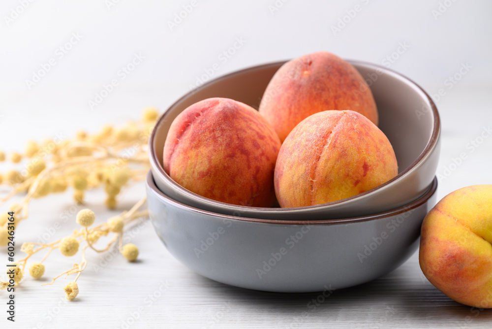 Ripe Peaches fruit in bowl on white table