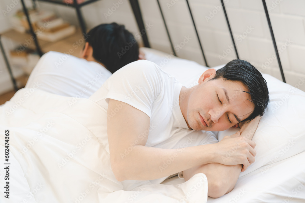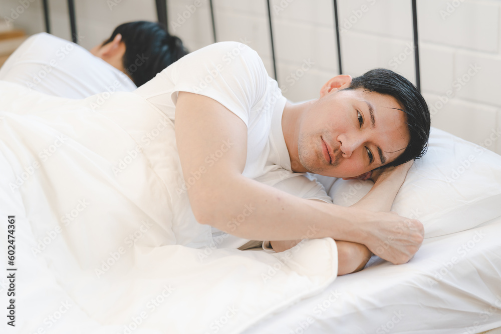 Asian gay couple feeling heartbroken for quarrel conflict and sleep in bedroom. Family problem separation. sad dissatisfied gay couple. Homosexual in problem relationship.
