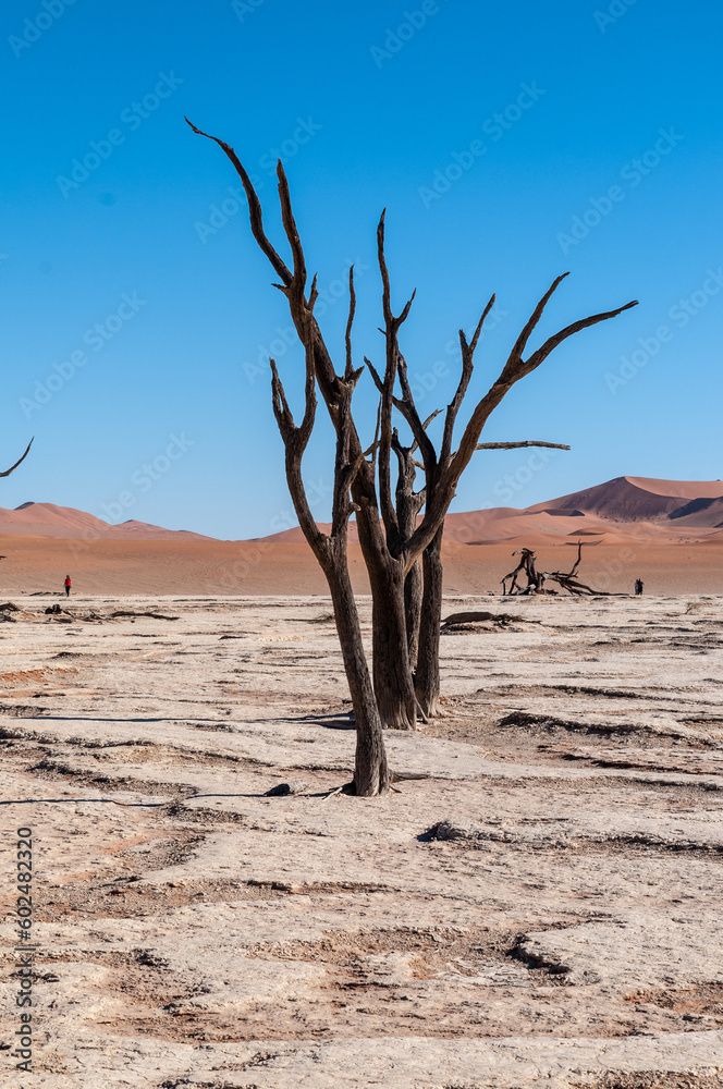 Landscape shot of the iconic dead trees of the Namibian deadvlei area.