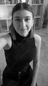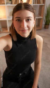 Video blog. Live streaming. Positive pleased pretty woman creating content live streaming shooting video talking online with subscribers home interior.