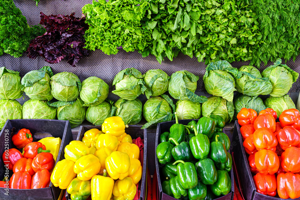 A stall with greens and vegetables on a bazaar. Bunch of green dill.