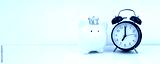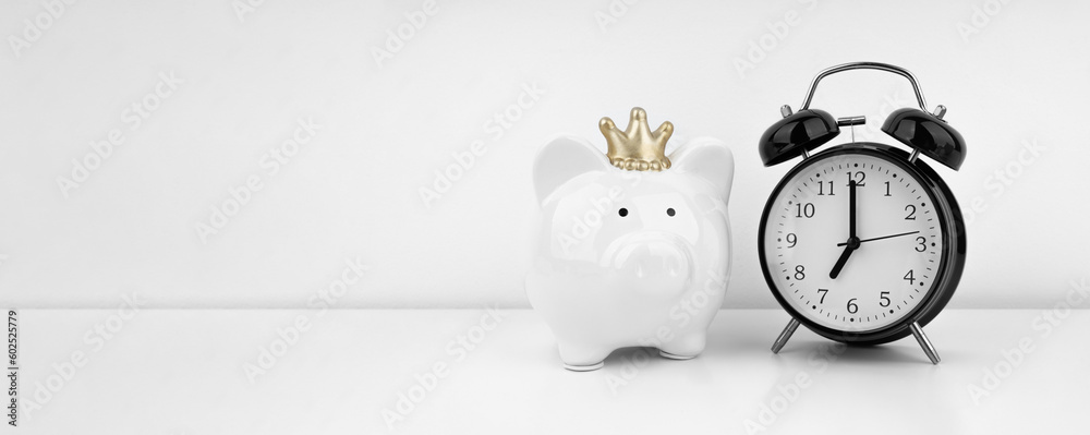Black alarm clock with piggy bank against a white wall. Financial concept.