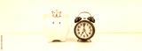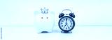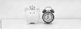 Red alarm clock with piggy bank against a white wall. Financial concept.