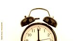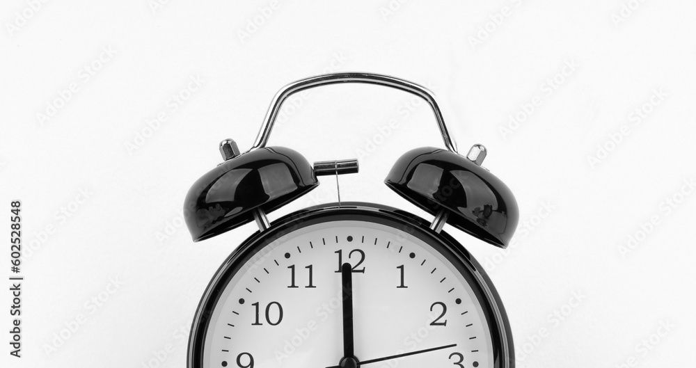 Black alarm clock on white wall background