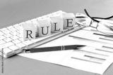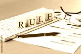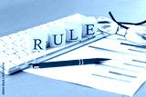 RULE written on a wooden cube on the keyboard with chart on grey background