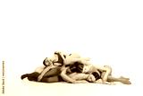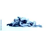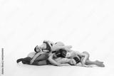 Group of tender, young girls, ballet dancers in colorful, bright clothes lying on each other on floor, dancing against grey studio background. Creativity, classic dance style, contemporary art concept