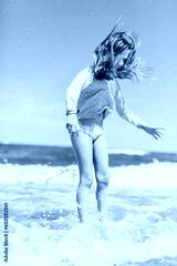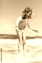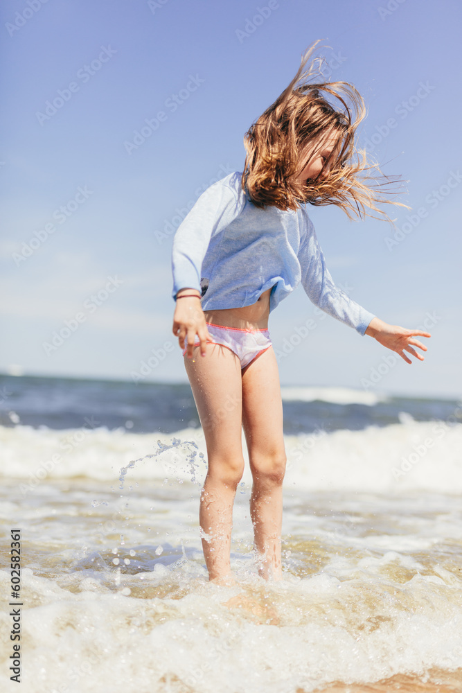 Young girl playing on the beach in waves at summer