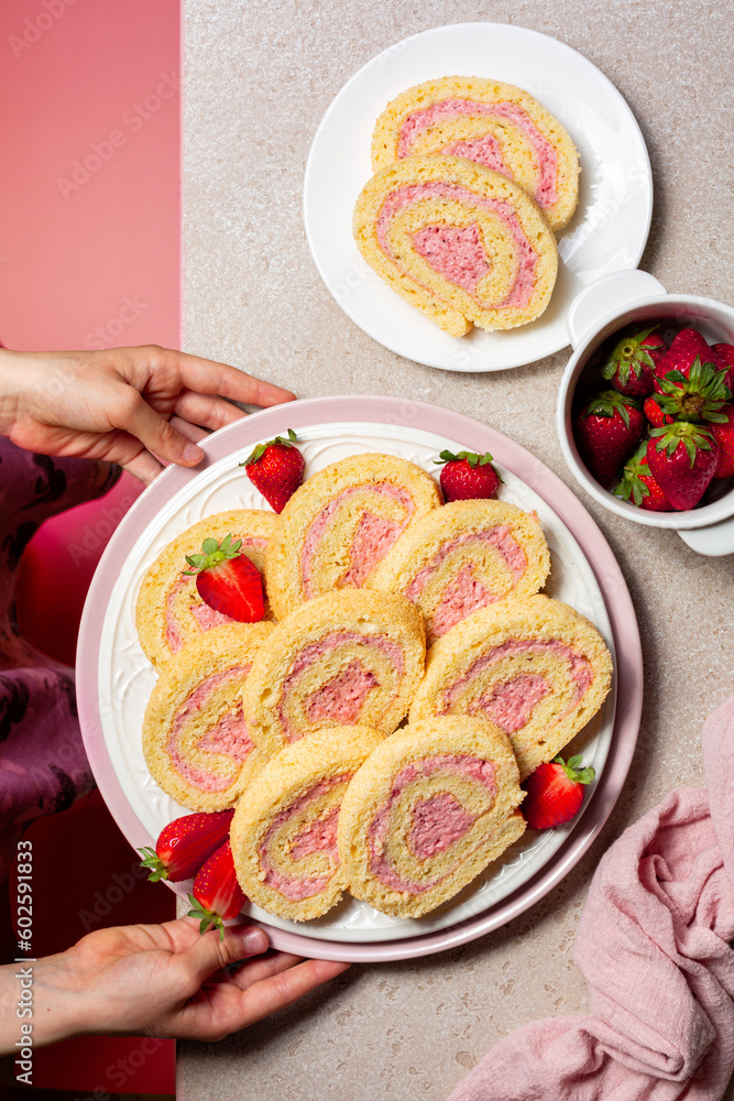 Homemade roll cake with strawberry cream. Homemade pastry.