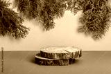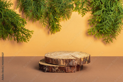 Natural style. Two wooden cutouts, round podiums with thuja branches on a beige background. Presentation of natural organic products. Selective focus.