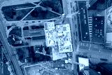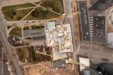 Drone photography of urban construction site of skyscraper complex in the middle of other structures during spring sunny day