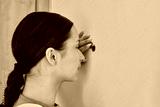 Young teenage female looking through peephole on front door