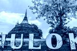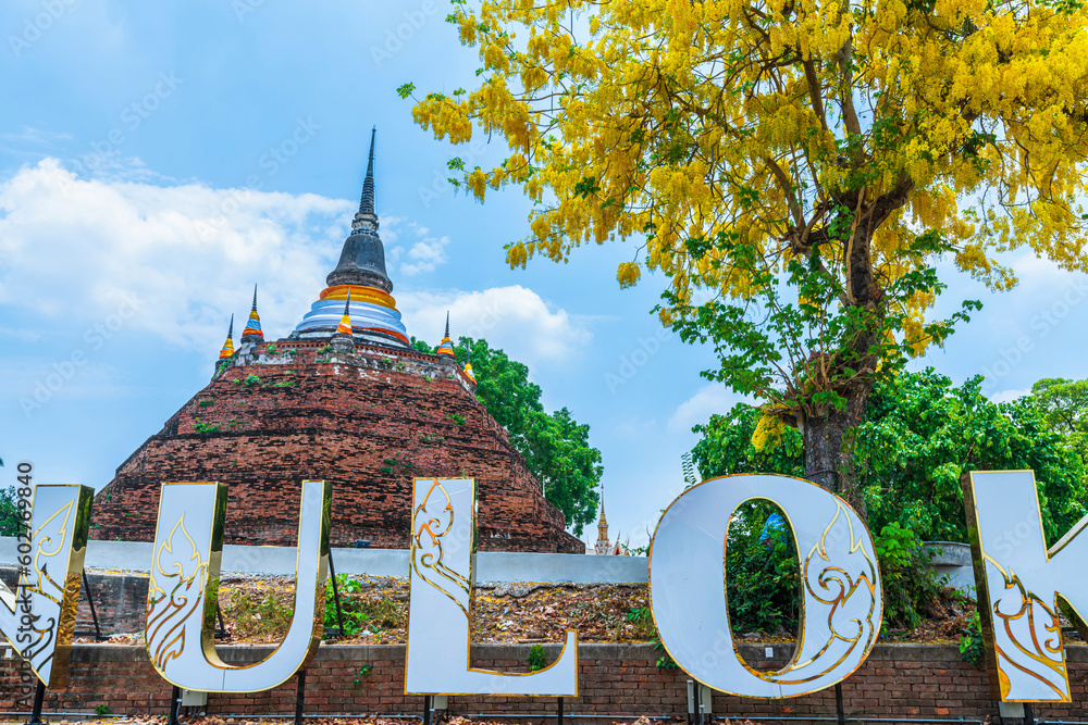 Text letter light Phitsanulok city and Golden Cassia fistula flowers at Park in Phra Chedi Luang in Temple (Wat Ratchaburana) is a major tourist attraction in Phitsanulok Thailand.daytime blue sky