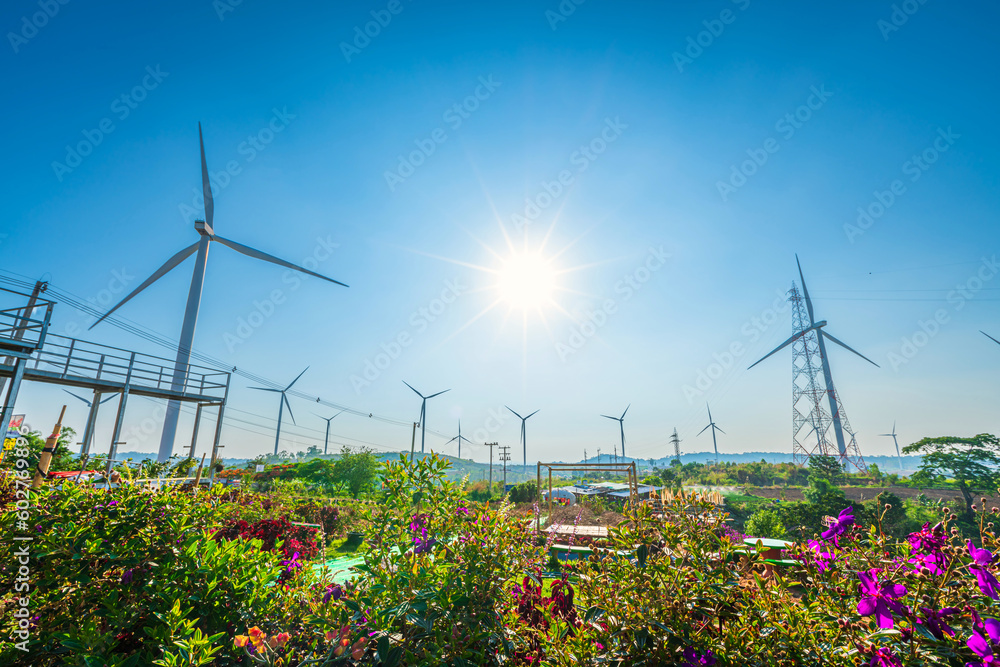 Wind turbines on hill in the khao kho park, Thailand. Clean energy, eco power energy, Green energy.