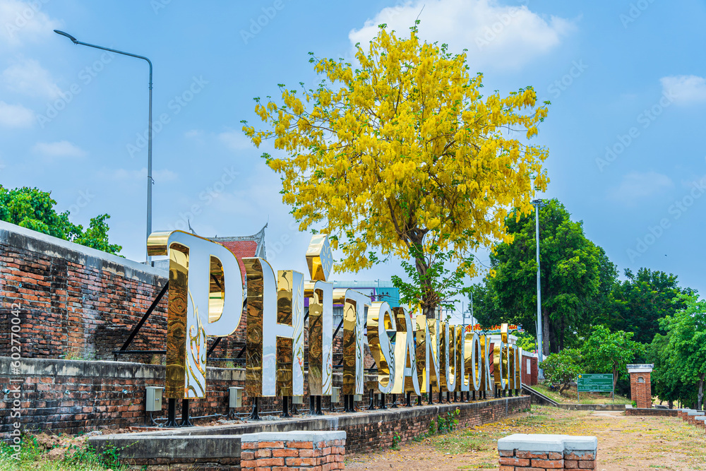 Text letter light Phitsanulok city and Golden Cassia fistula flowers at Park in Phra Chedi Luang in Temple (Wat Ratchaburana) is a major tourist attraction in Phitsanulok Thailand.daytime blue sky