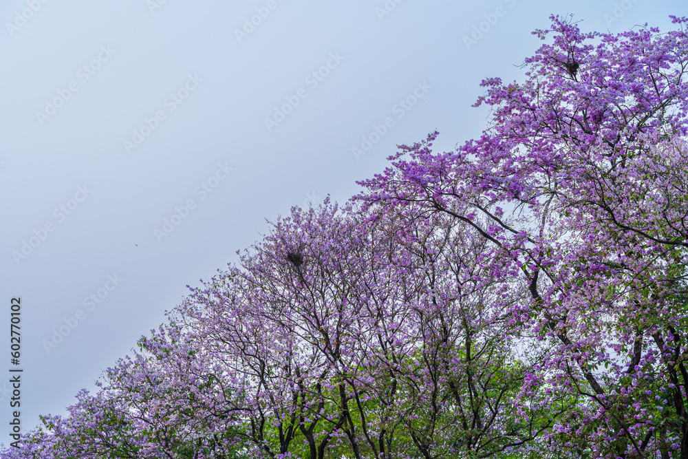 Beautiful blooming bungor (Lagerstroemia loudonii Teijsm. Binn) flowers Thai bungor tree and green leaves with the park in spring day blue sky background Thailand.