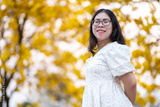 Happy Relaxing Portrait asian woman in Beautiful blooming Yellow Golden Tabebuia Chrysotricha flowers with the park in spring day at Evening background in Thailand.