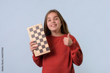 A young chess fan. A teenage girl with a chessboard in her hand looks at the camera with her thumb up. Red sweater, light blue background