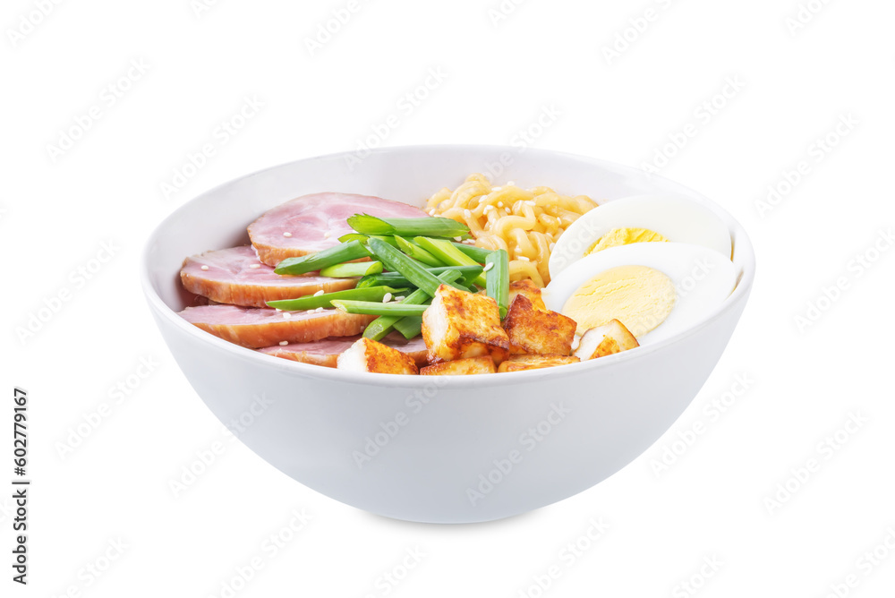 Ramen noodle with meat slices, fried Tofu, eggs and scallions in a bowl on a white isolated background