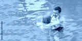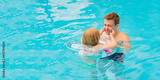 Dad and daughter have fun and swim with inflatable circle in the pool.