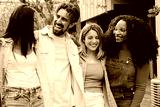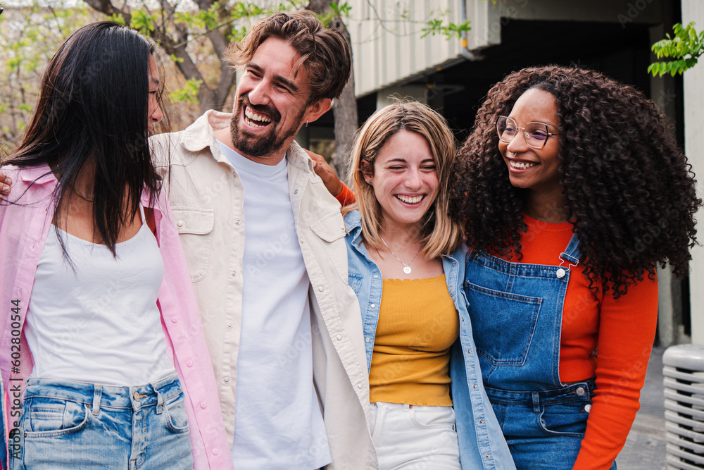 Group of multiracial happy friends smiling and laughing together on a social meeting. United cheerful young multiethnic people having fun. Multicultural international community hugging on vacation
