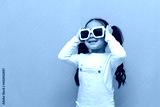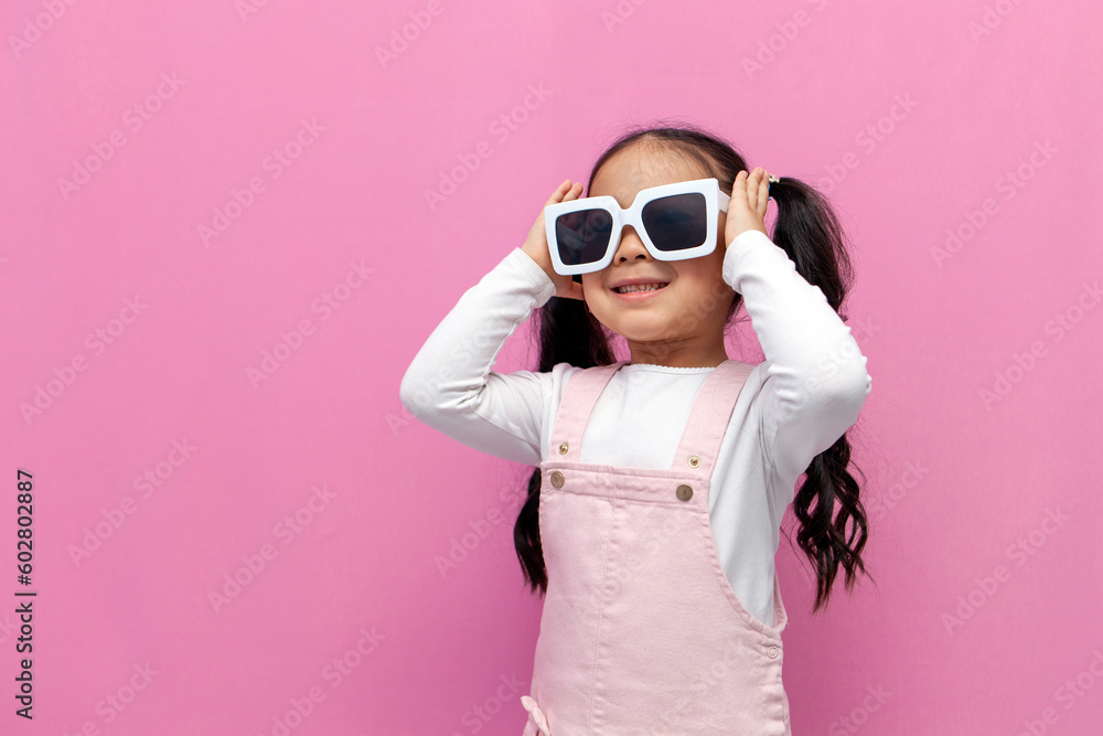 little girl of preschool age in white sunglasses and pink sundress on pink isolated background, child in glasses looks