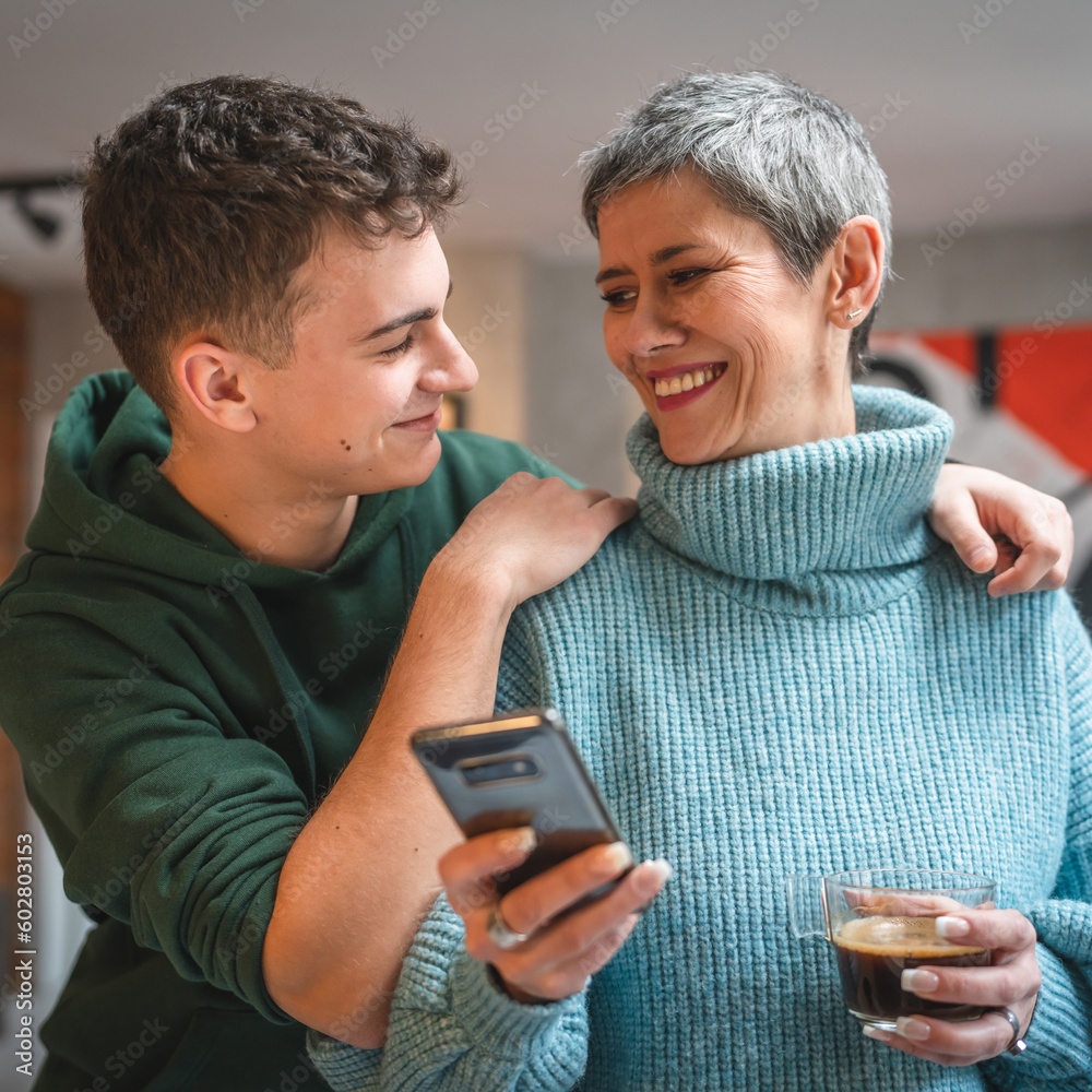 teenager boy young man and mature woman mother and son take selfie photos self portraits at home