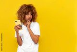 young pensive curly american girl use smartphone think and dream on yellow isolated background