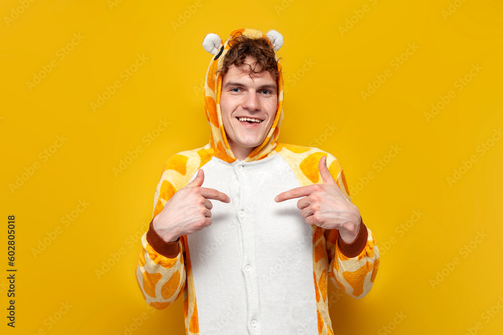 young joyful guy in funny children's giraffe pajamas points his fingers at himself on yellow background