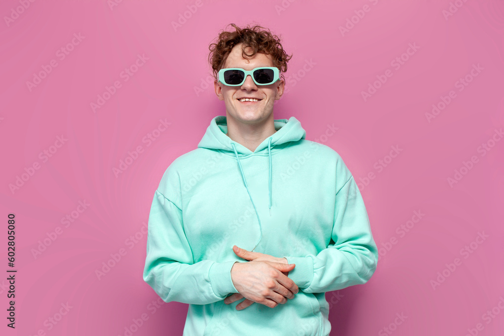 curly guy in mint hoodie and sunglasses smiles on pink isolated background, man in blue sweatshirt and glasses