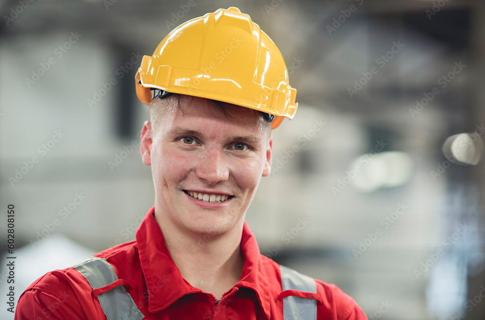Portrait of smiling Caucasian professional heavy industry engineer wearing safety uniform and yellow helmet in industrial factory, blurred background.