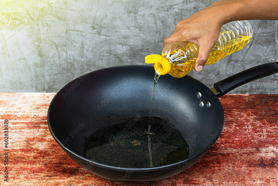 Pour the vegetable oil into the pan for cooking.
