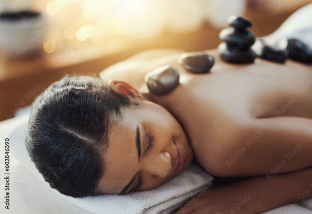 Happy woman, relax and sleeping in rock massage at spa for skincare, beauty or body treatment. Calm female asleep in relaxation with hot rocks or pile on back in therapy, zen or wellness at salon