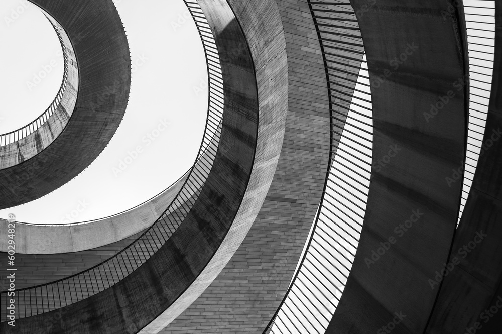 Geometric abstraction in the form of chaotic semicircles and arcs of different textures and from different materials. Black and white photo