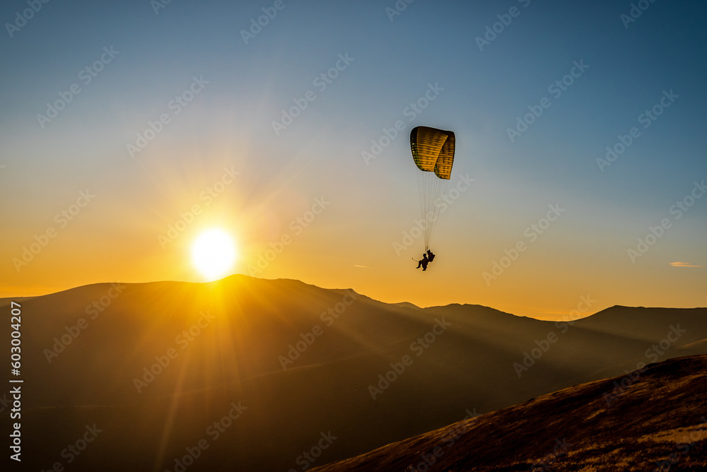 Paraglide silhouette in a light of sunrise above the Carpathian mountains