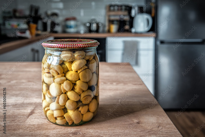 Pickled mushrooms in a glass jar close-up. Marinated mushrooms with pepper grains and bay leaf